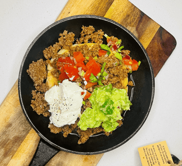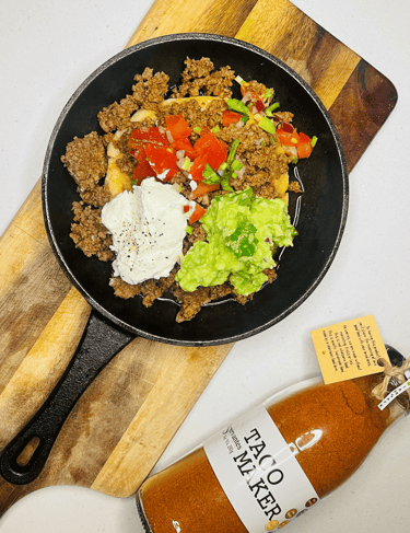 Cook the protein in Cow Gold, add Taco Maker, salt, and tomato purée. Cook 15 min.
