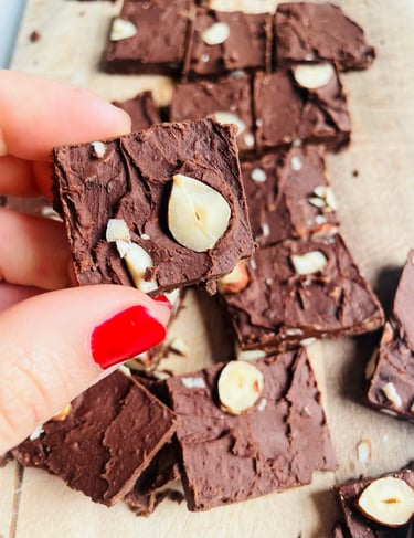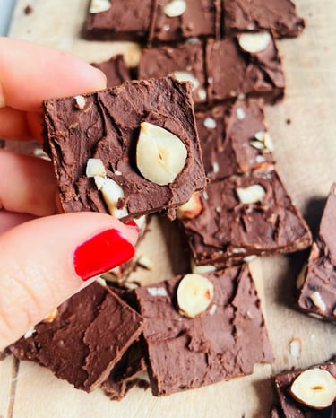 Steps: Mix cocoa and coconut oil until thick. Add honey, dates, hazelnuts, and salt. Top with more hazelnuts. Place it on a tray. Chill 2+ hours. Try not to eat it all at once!