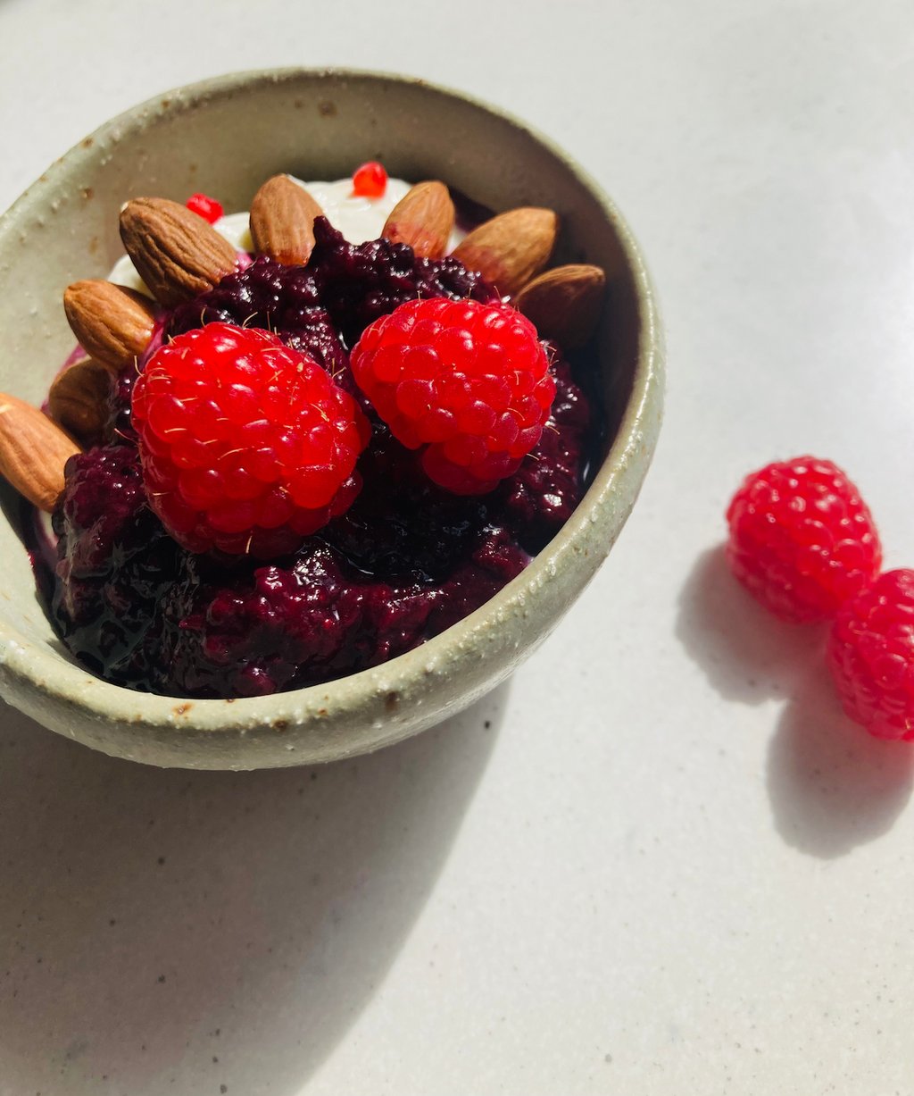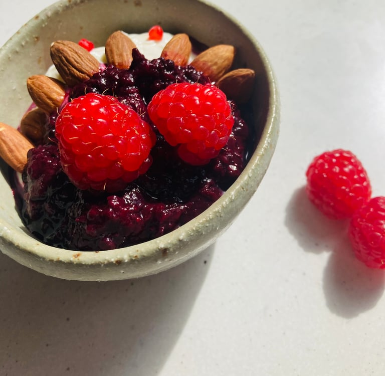 Mix yogurt with honey. Top with jam, nuts, and berries.